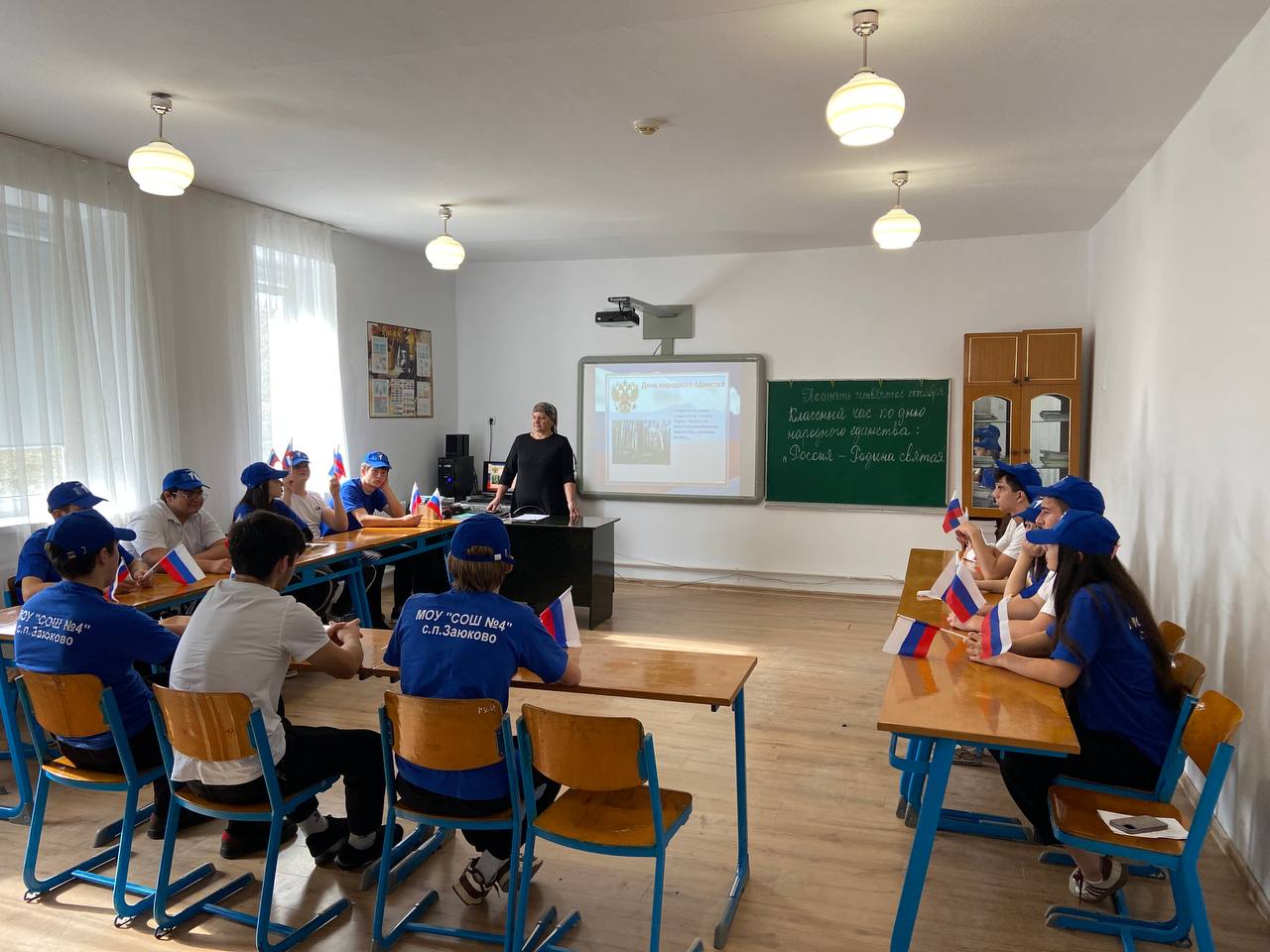 В рамках Всероссийской детской культурно-просветительской акции «Я — россиянин» для учащихся 9-11 классов учителем истории Тлизамовой М. З. был организован просмотр видеоролика о России. Учащиеся узнали почему 4 ноября стало памятной датой для всей страны и какие исторические события легли в основу этого праздника. Также обсудили ключевые ценности, которые помогают людям разных культур жить в мире и согласии.
